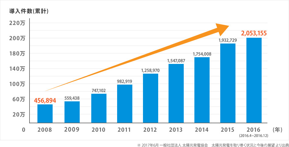 太陽光発電を設置するご家庭が増えています! 太陽光発電を導入した世帯数の推移 現在日本のエネルギーの自給率はわずか4%。 再生可能エネルギーは、国産エネルギーととらえることができるので、エネルギー自給率アップにつながります。 再生可能エネルギーは、地球にやさしいエネルギーなので温暖化対策にも役立ちます。 再生可能エネルギーを利用した発電には、日本の得意な技術を生かせるため、日本の将来を支える産業を育てることができます。